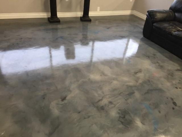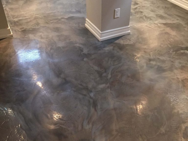 Metallic epoxy floors are quite possibly the hottest flooring system on the market, our new Metallic Marble Stain combines the industrial strength of epoxy with specially formulated metallic pigments. Above and beyond traditional concrete staining. The luster and depth of a three-dimensional color produced with this popular process will amaze everyone that enters your business or home. A satin urethane, matte or gloss can be added to simulate a natural marble finish. The results are amazing! The beauty and depth of this floor will enhance your business or home like no other.